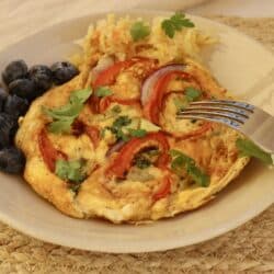 Paleo. En enkel och mättande omelett med ägg, paprika, avokado och lök. För extra c-vitamin lägg till en handfull med blåbär och för extra probiotika en klick med surkål eller kimchi.