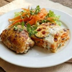 Kycklinglår med sötpotatis- och zucchinigratäng