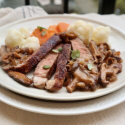 Entrecôte med rödvinsinspirerad shiitakesås och kokta grönsaker
