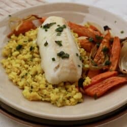 AIP. Ugnsbakad torskrygg med rotsaker och vitlök, serverad med blomkålsris med purjolök och gurkmeja. Tillsätt benbuljong i riset för extra näring om du vill.