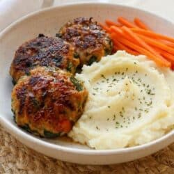 Biffar på kycklingfärs, morot och spenat med krämigt mos