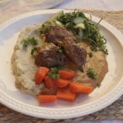 AIP. Festlig rätt med kalvfärsbiffar, jordärtkockspuré, gräddig sås och syrlig sallad. Passar perfekt till lite finare middag eller lyxig vardagskväll.