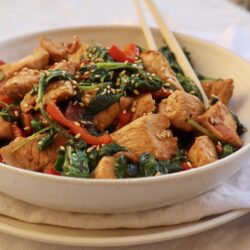 Paleo. Kyckling steks tillsammans med paprika, lök och vitlök i en sås med asiatisk smak. Mot slutet vänds färsk spenat ner och rätten toppas med rostade sesamfrön som ger lite extra textur.