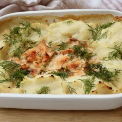 Fiskgratäng med lax, citrussås och blomkålsmos