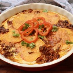 Gratäng med köttfärsås och tunt skivad sötpotatis