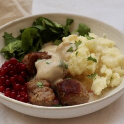 Paleo. Klassiska köttbullar på nötfärs med en krämig potatismos och en smakrik brunsås baserad på kokosmjölk och kokosaminos. Rårörda lingon ger en fin balans med sin syra, och färsk persilja lyfter smakerna i både såsen och på köttbullarna.