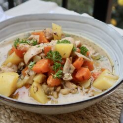 Paleo. Fyllig gryta där kycklinglårfilé, potatis, morot och schalottenlök får sjuda tillsammans med timjan och buljong. Smaken blir rund och mild med en naturlig sötma från löken och rotfrukterna.