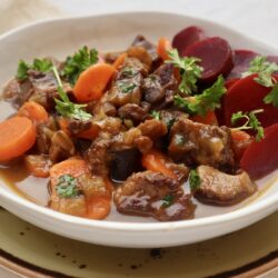 Kalops med morötter, svamp och inlagda rödbetor