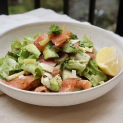 AIP. Kallrökt lax kombineras med krispig sallad, gurka, purjolök och avokado. Dressingen är syrlig och örtig med dill, citron och vinäger och binder ihop salladen fint.