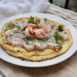 Paleo. Omelett serverad med krämig räkstuvning gjord på kokosmjölk och dill. Passar bra till frukost eller lunch och kan serveras med sallad, tomat och gurka.