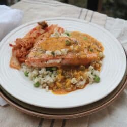 Paleo. Ugnsbakad lax med kryddat blomkålsris och gröna ärtor samt en saffranssås med chilihetta. Kimchi vid sidan ger syra och tillskott av fermenterade mjölksyrabakterier.