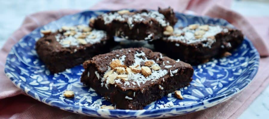AIP. Fyra smårutor brownies på zucchini, tapiokamjöl, kokosmjölk och carob. Söta med honung efter egen smak. Gott till fikat och enkla att göra. Servera med lite hyvlade jordmandlar och kokosflingor på toppen. Hyvlade/rivna torkade jordmandlar finns att köpa online.