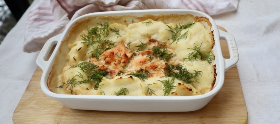 Gör så här Klicka för att bocka av 1 Sätt ugnen på 200 grader. 2 Koka blomkålen mjuk i lättsaltat vatten. Häll av och låt ånga torr någon minut. 3 Mosa blomkålen med kokosmjölk till ett slätt, krämigt mos. Ställ åt sidan. 4 Lägg laxen i en ugnsform. 5 Blanda kokosmjölk, kokos aminos, citronskal, lite citronsaft, ingefära, vitvinsvinäger och näringsjäst i en liten kastrull. 6 Låt såsen sjuda försiktigt i ca 10 minuter och smaka av. 7 Häll såsen över laxen. Klicka eller spritsa blomkålsmoset runt och delvis över laxen. 8 Tillaga i ugnen ca 20–25 minuter, tills laxen är klar och moset fått lätt färg. Toppa med färsk dill. Det här receptet ingår i medlemskapet Som medlem får du tillgång till detta recept och 1400+ fler, tillsammans med veckomenyer, matlagningsfilmer och startprogram. Prova gratis i 14 dagar Utforska fler gratisrecept