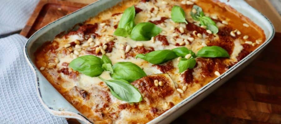 Lasagne med zucchini, spenat, pinjenötter och tomatsås